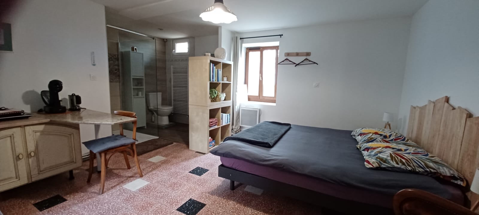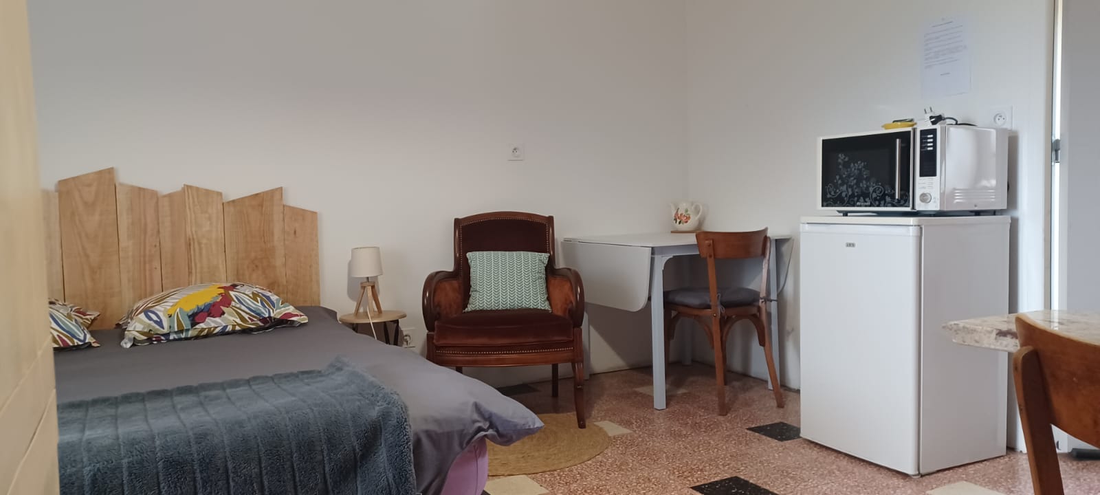 Pour les personnes à mobilité réduite, nous disposons d’un studio indépendant accessible et entièrement équipé. Il se trouve dans le prolongement de notre habitation, à côté du gîte.